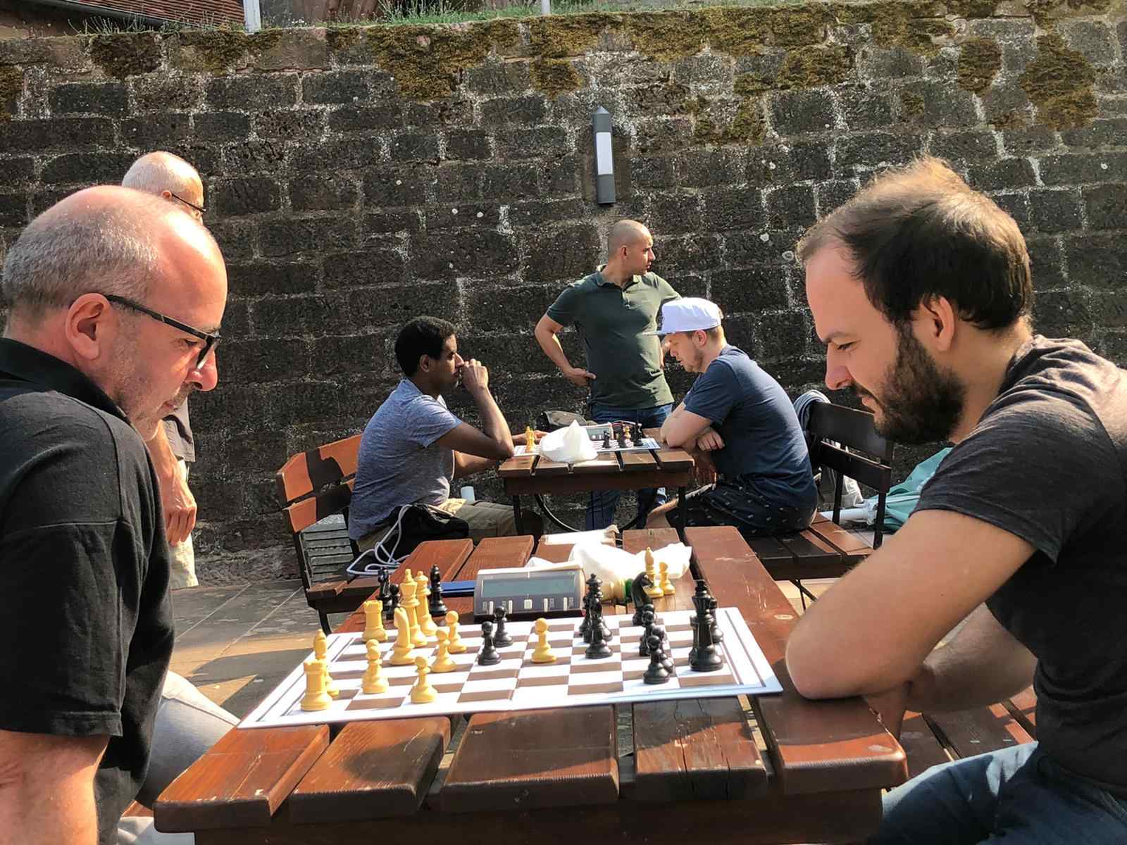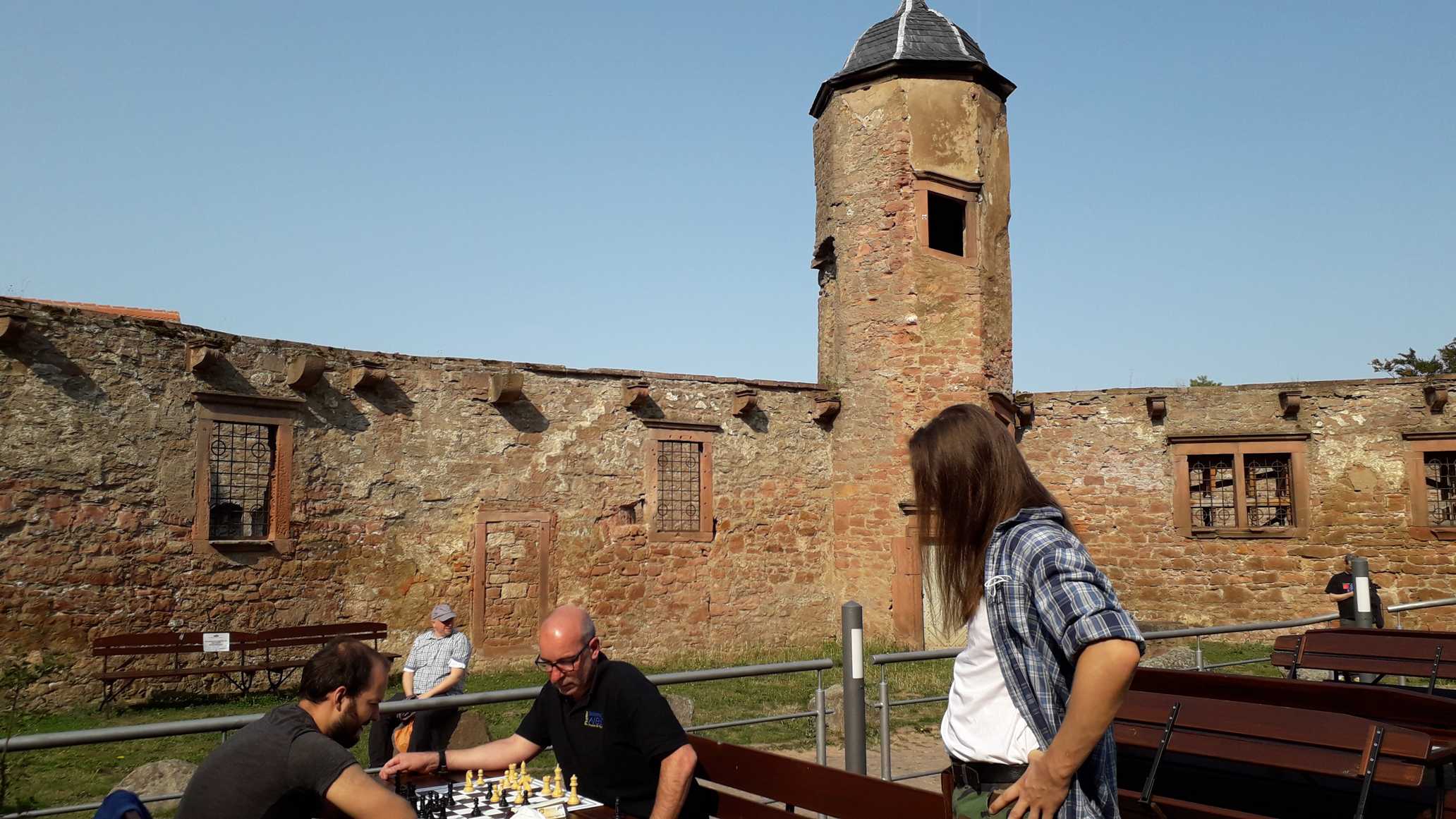 Die Sonne machte der Kartause das Leben schwer. Partie 1: Samuel übersieht ein einzügiges Matt. Partie 2: Uli übersieht ein einzügiges Matt.